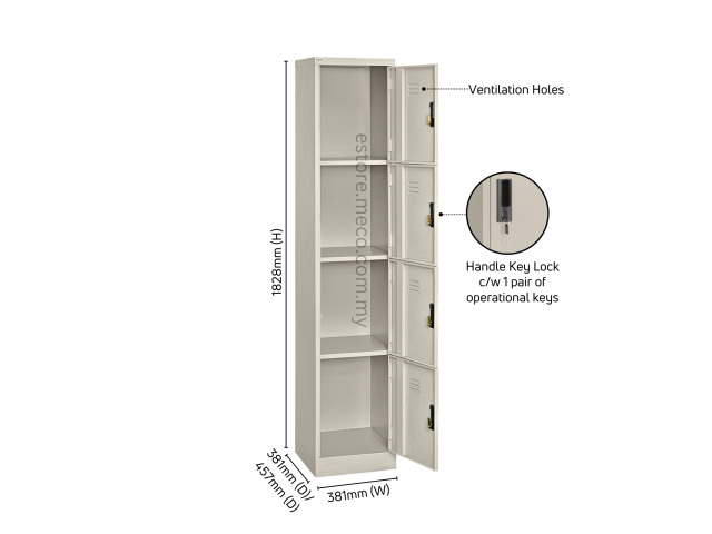 4-compartment steel locker cabinet. These lockers are durable, sturdy and have ventilation holes for easy air circulation. Moreover these lockers ensure safety which gives peace of mind for user to store personal and valuable items. The door with a plastic handle key lock system and there are 2 secure door hinges & with termite resistant. This unit has been tested for office use and meets the requirements for safety. It`s recommended for factory, hostel, home, colleges, institutes or office use .